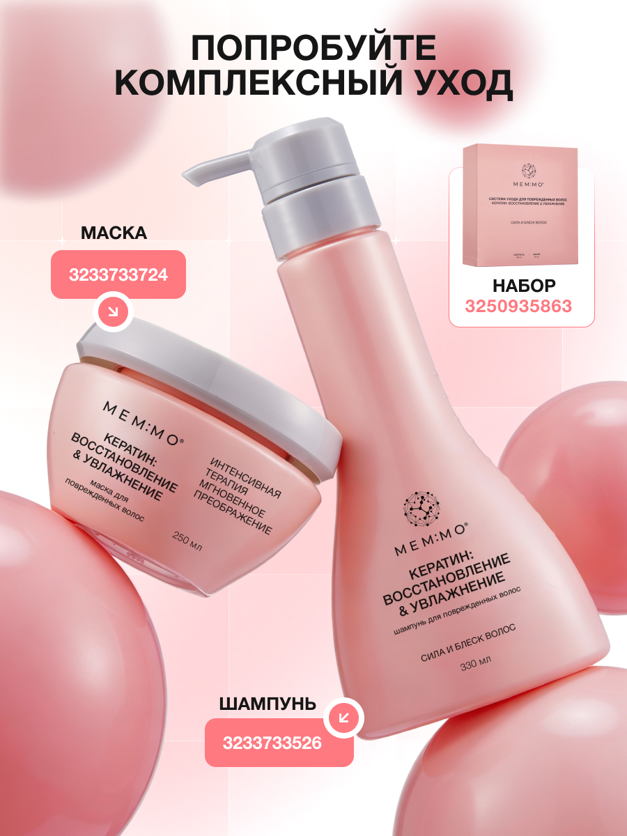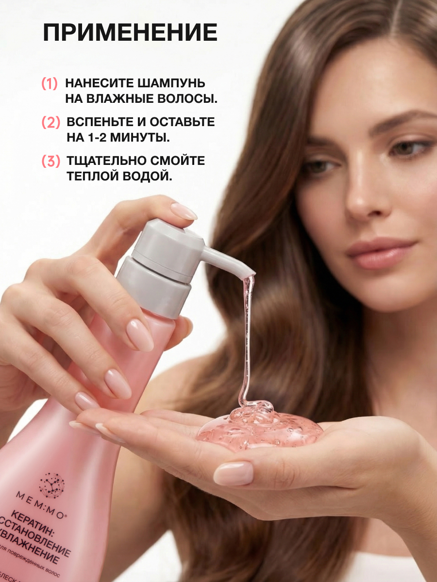 4. Для достижения комплексного результата используйте вместе с Маской для волос «Кератин: Восстановление & Увлажнение» МЕМ:МО. Шампунь лечит и подготавливает, маска — интенсивно восстанавливает и увлажняет.