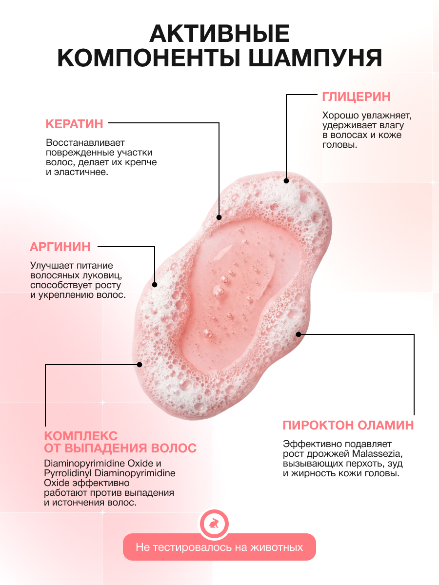 Шампунь создан для комплексного решения: он оздоравливает кожу головы, укрепляет волосы от корней и начинает процесс их глубокого восстановления.